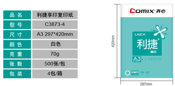 齐心(comix)齐心多功能复印纸 双面打印纸 C3873-4 利捷复印纸70克 A3 4包/件 3