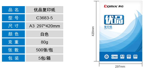 齐心(comix)齐心多功能复印纸 双面打印纸 C3683-5 优品复印纸 A3 80克