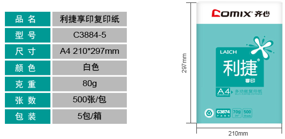 齐心(comix)齐心多功能复印纸 双面打印纸 C3884-5 利捷复印纸80克 A4 5包/件 5