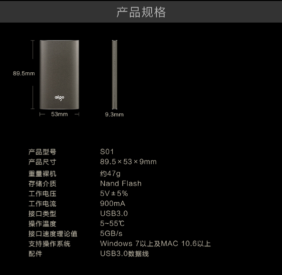 爱国者(aigo)S01 480G 移动固态硬盘 USB3.0 名片大小 金属抗震防摔 SSD 固态