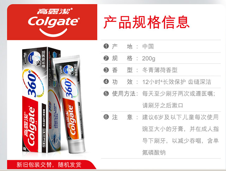 高露洁(Colgate)360°新品 双锌备长炭深洁 牙膏200g(冬青薄荷,清新口气)