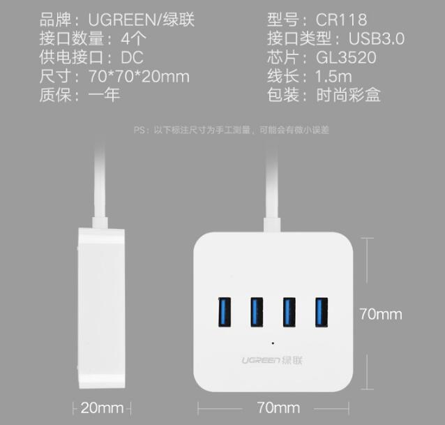 绿联(UGREEN)USB3.0分线器 高速4口HUB 多接口扩展转换器 笔记本电脑一拖四集线器延长