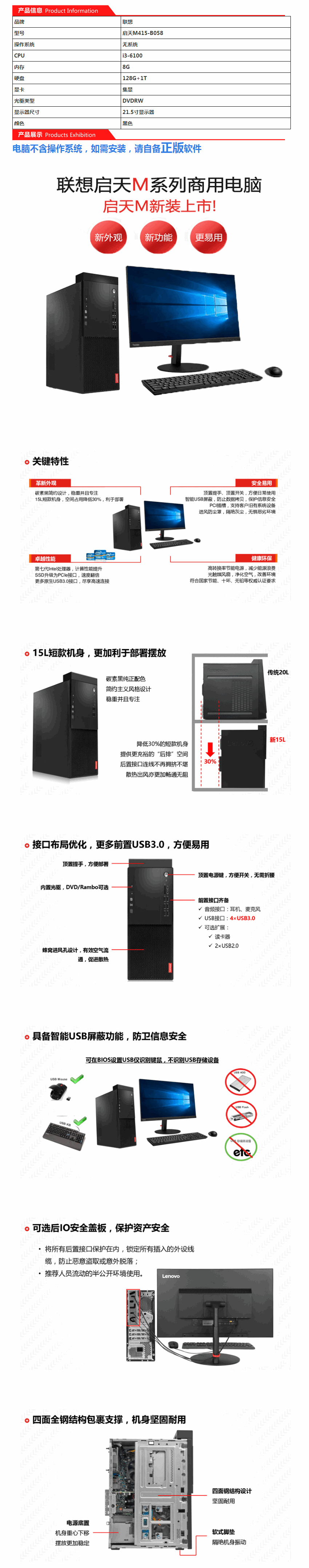 联想台式电脑 启天M415-B058 i3-61008G128G+1T集显DVDRWDOS21.5寸