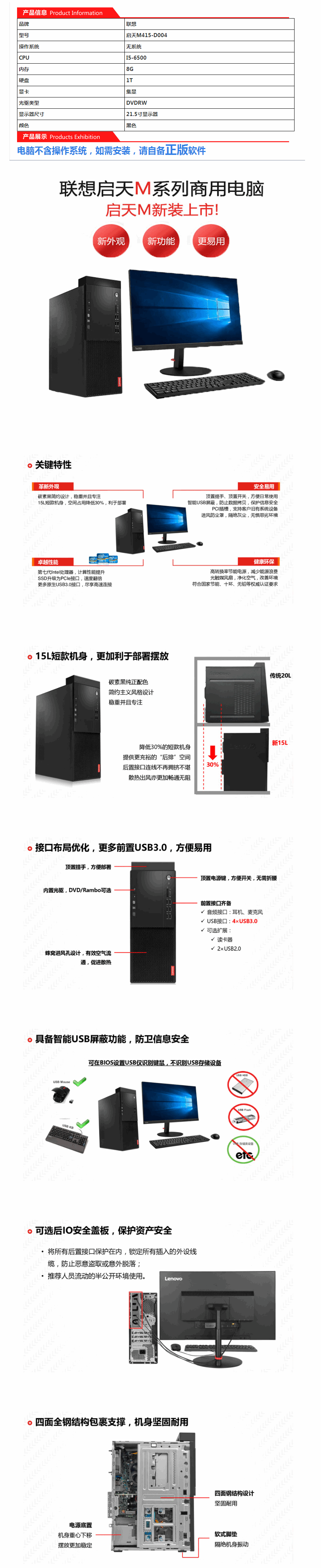 联想台式电脑 启天M415-D004 I5-6500/8G/1T/集显/DVDRW/无系统/21.5