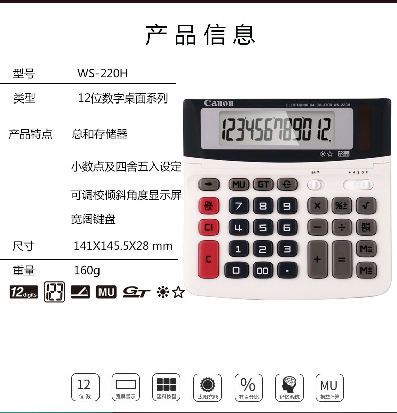 佳能(Canon)WS-220H计算器 12位 太阳能计算机