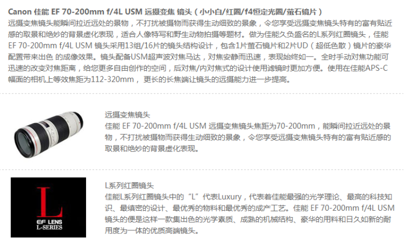 佳能(Canon) EF 70-200mm f/4L USM 远摄变焦镜头