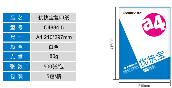 齐心(comix)齐心多功能复印纸 双面打印纸 C4884-5 优快宝复印纸80克 A4 5包/件