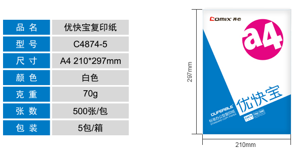 齐心(comix)齐心多功能复印纸 双面打印纸 C4874-5 优快宝复印纸 A4 70G 5包/件