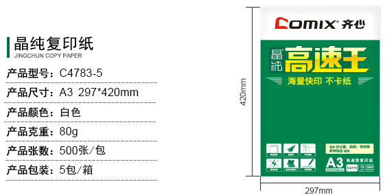 齐心(comix)齐心多功能复印纸 双面打印纸 C4783-5 晶纯高速王复印纸80克 A3 5包/
