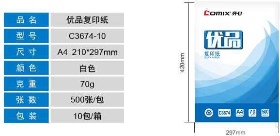 齐心(comix)齐心多功能复印纸 双面打印纸 C3674-10 优品复印纸 A4 70克