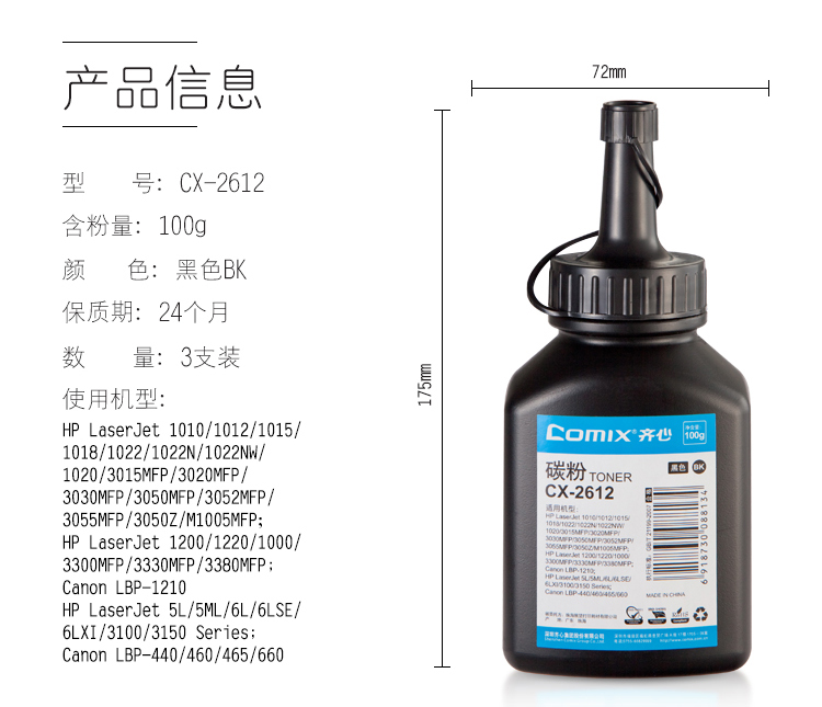 齐心 CX-2612 打印机碳粉(1彩盒装3PCS)