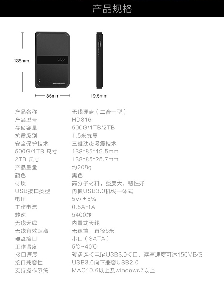 爱国者(aigo) HD816 1TB 无线移动硬盘 USB3.0 黑色
