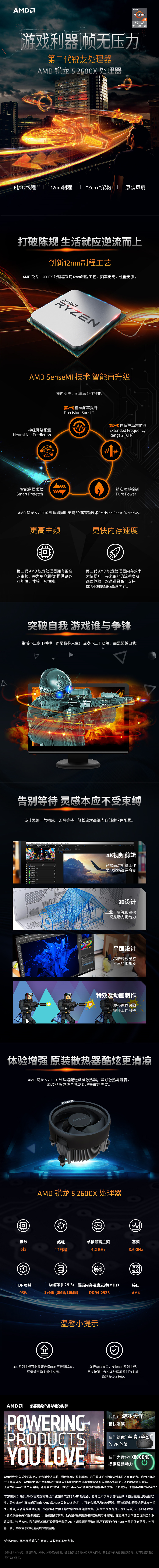 AMD 锐龙 5 2600X 处理器 6核12线程 AM4 接口 3.6GHz 盒装CPU处理器